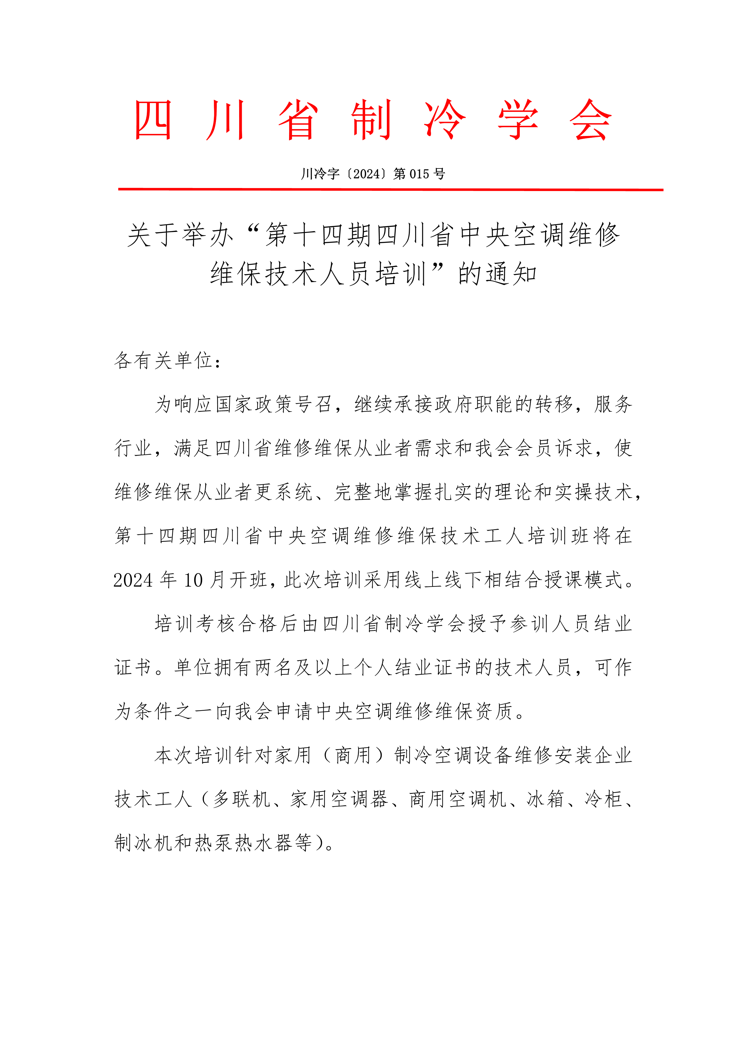 關于舉辦“第十四期四川省中央空調維修維保技術人員培訓”的通知