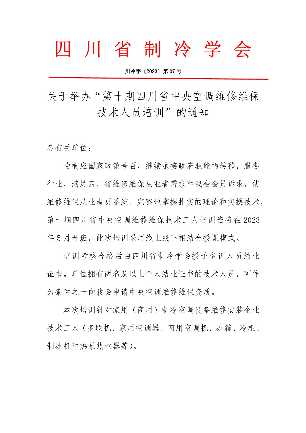 關于舉辦“第十期四川省中央空調維修維保技術人員培訓”的通知