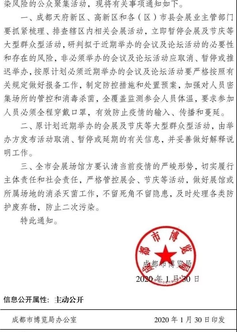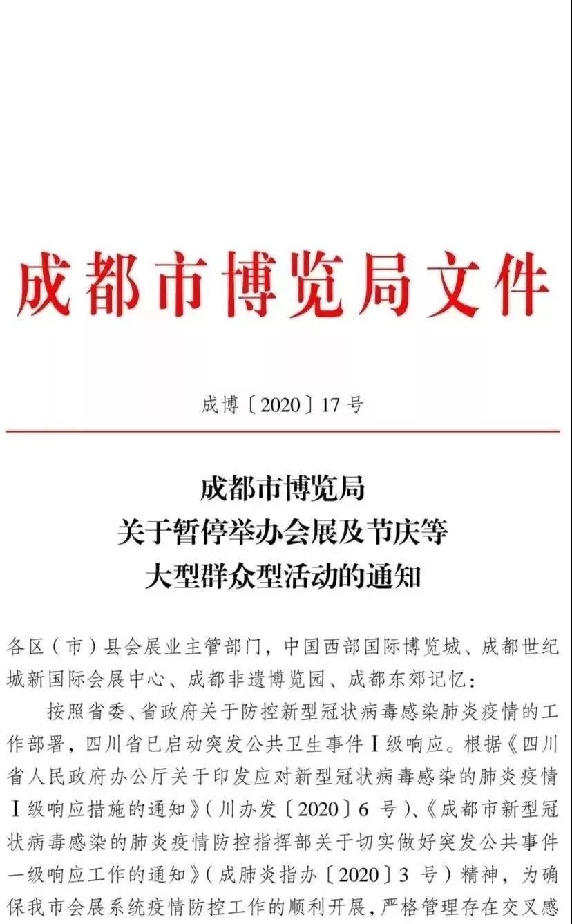 ? ? ? ? 鑒于目前全國人民抗擊新型冠狀病毒感染肺炎疫情的堅戰已進入關鍵時刻,四川省已啟動突發公共衛生事件一級響應,根據黨中央、國務院關于應對新型冠狀病毒感染肺炎疫情防控工作部署以及《成都市博覽局文件》成博[2020]17號的要求(詳細請見下文),在疫情防控期間暫停一切會展及節慶等大型群眾聚集性活動。