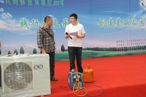 除此之外,在活動周期間我們還成功舉辦了“制冷設備舊貨市場大型環保公益宣傳活動”。2014年9月19日下午,四川省2015年“9.16國際保護臭氧層日”宣傳周之“制冷設備舊貨市場大型宣傳活動”在西南大型新舊貨批發市場李家祠分場(四川省成都市武侯區涼港大道251號)舉行。四川省環境保護廳張金漢副巡視員、四川省環境科學學會王卓秘書長、冷冰副秘書長、四川省制冷學會袁艷平秘書長、成都信息工程大學資源環境學院葉芝祥院長等相關領導出席了宣傳活動。